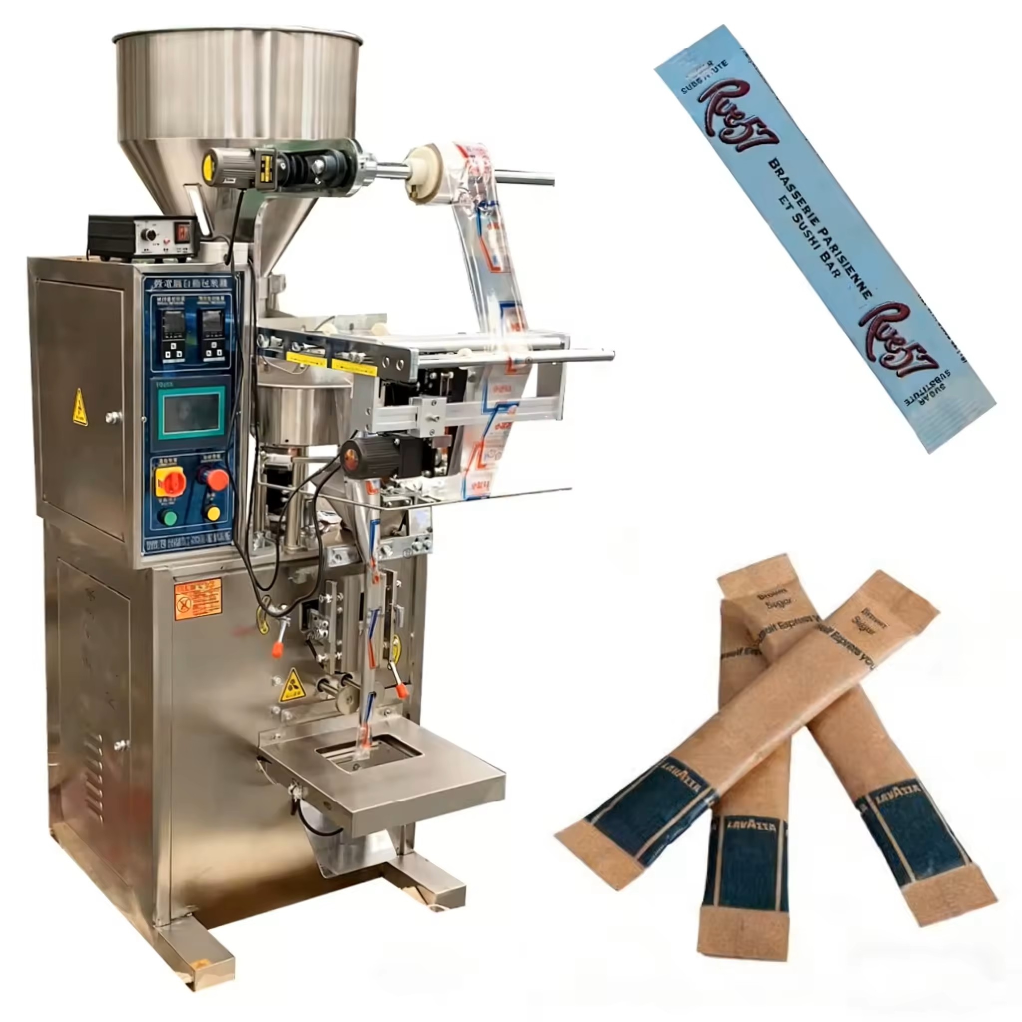 Máy đóng gói đường que tự động là thiết bị chuyên dụng dùng để đóng gói đường dạng hạt mịn vào các túi nhỏ dạng que (stick pack). Máy thực hiện toàn bộ quy trình tự động, bao gồm: